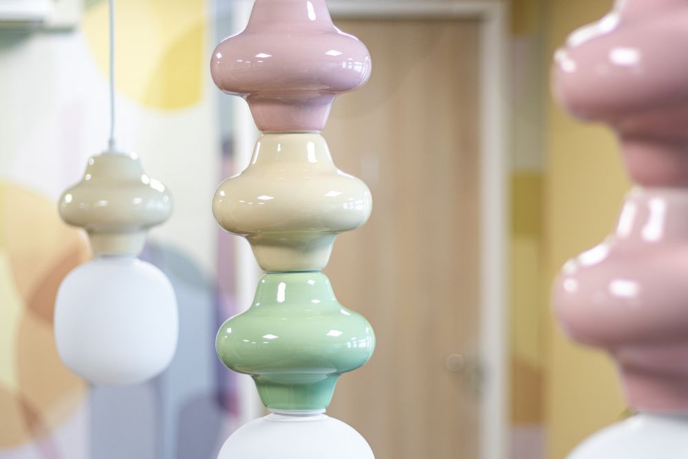 Een belangrijk uitgangspunt in het ontwerp was het terug laten komen van de zwangere vrouw in de vormgeving. Dit heb ik op een subtiele manier gedaan door ronde vormen toe te voegen in behang, meubels en verlichting. Vooral in het behang zijn deze ronde vormen terug te zien, geïnspireerd op de vormen van een zwangere buik. Daarnaast bevat het behang alle kleuren uit de huisstijl, wat de samenhang versterkt en tegelijkertijd zorgt voor een warme, uitnodigende sfeer. De behandelkamers hebben allemaal hetzelfde behang en dezelfde lambrisering van muurverf, maar iedere kamer heeft een eigen kleurcombinatie. Zo ontstaat er eenheid in het interieur, terwijl iedere ruimte toch een eigen karakter en beleving heeft voor cliënten.