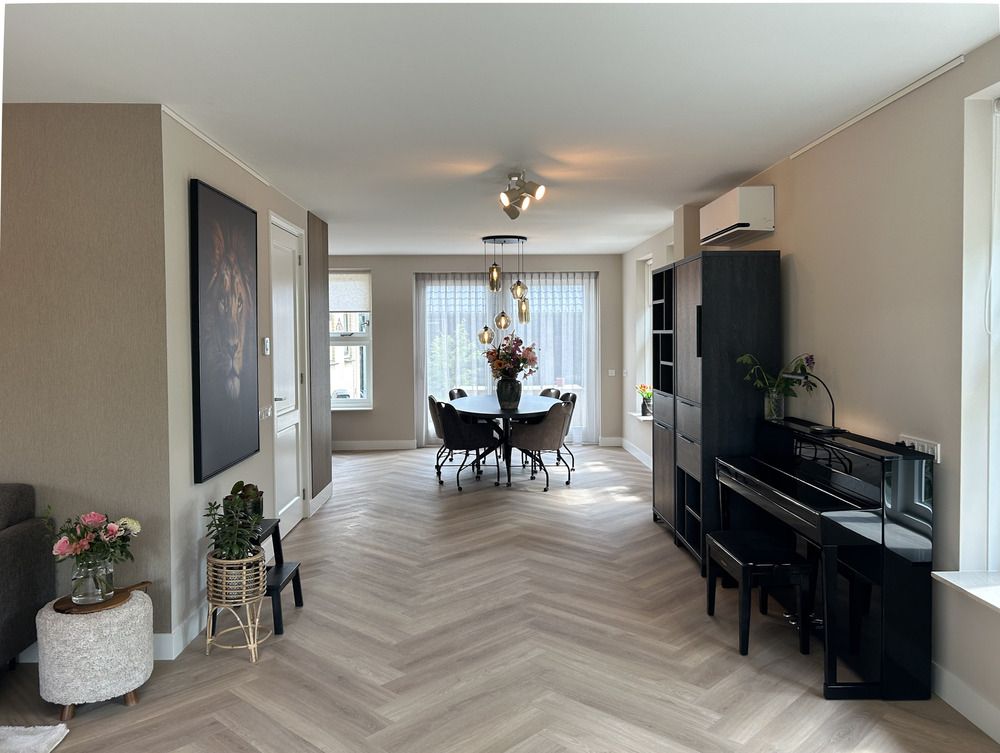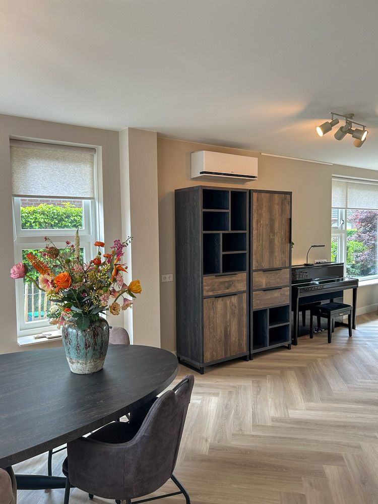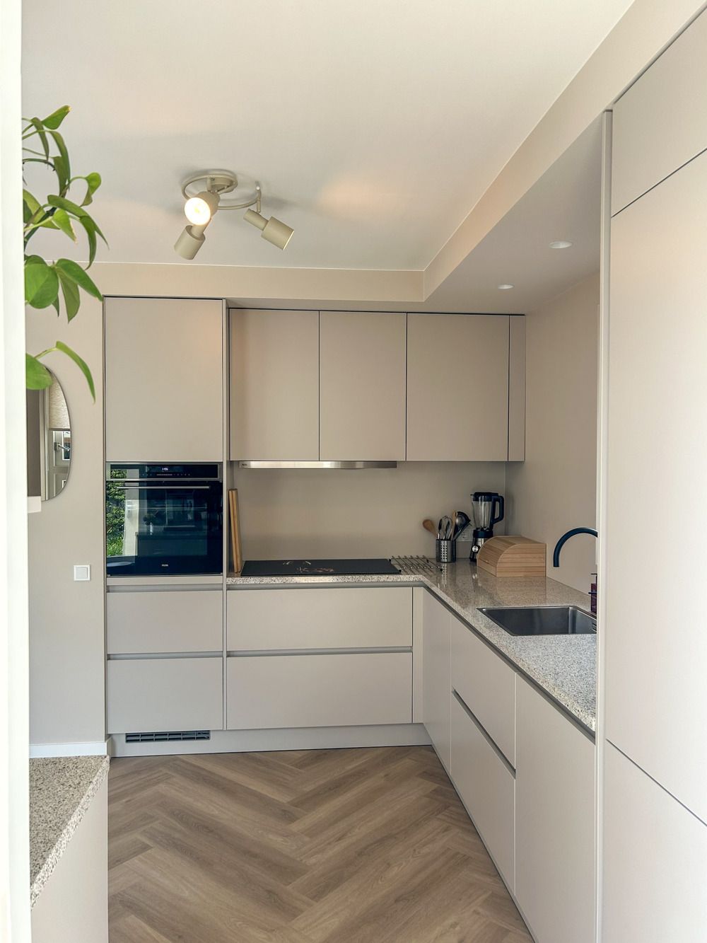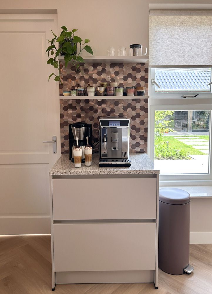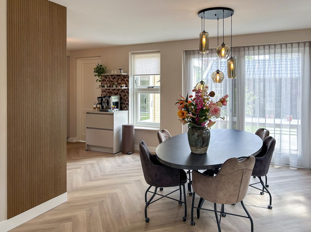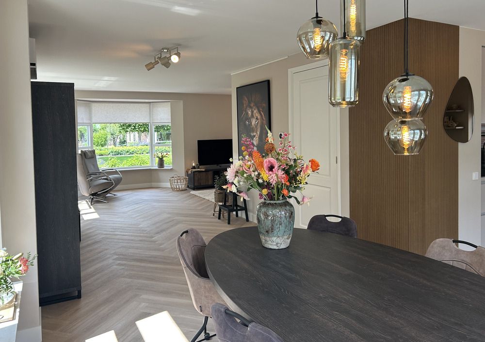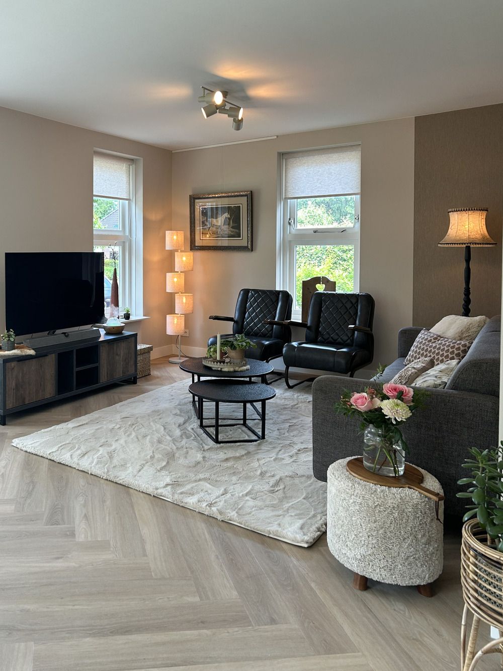 Voor dit leuke gezin uit Buitenpost heb ik een interieuradvies mogen geven waarin natuurlijke tinten de basis vormen. Het kleurenpalet is rustig en warm, met subtiele glansaccenten die het geheel nét dat beetje extra geven. Die glans komt op een verfijnde manier terug in het behang, dat speels om de hoek is geplakt, en in de achterwand van de koffiehoek. Samen zorgt dit voor een subtiel luxegevoel zonder de natuurlijke uitstraling te verliezen. We hebben zorgvuldig de kleuren voor de muren, keuken, raambekleding en de walvisgraatvloer uitgekozen, allemaal perfect passend bij de bestaande meubels. Het resultaat is een natuurlijk, sfeervol en tijdloos interieur.
